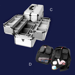 Maletín para maquillaje con ruedas, confortable muy movible. Este maletín de aluminio es muy estable, proporciona mucho lugar y una buena distribución para los materiales de trabajo. El maletín se abre de arriba y de frente. 3 cajones permiten transportar el maletín segura y ordenadamente. En la base ofrece lugar suficiente para guardar sprays, kleenex-box u otros utensilios. |